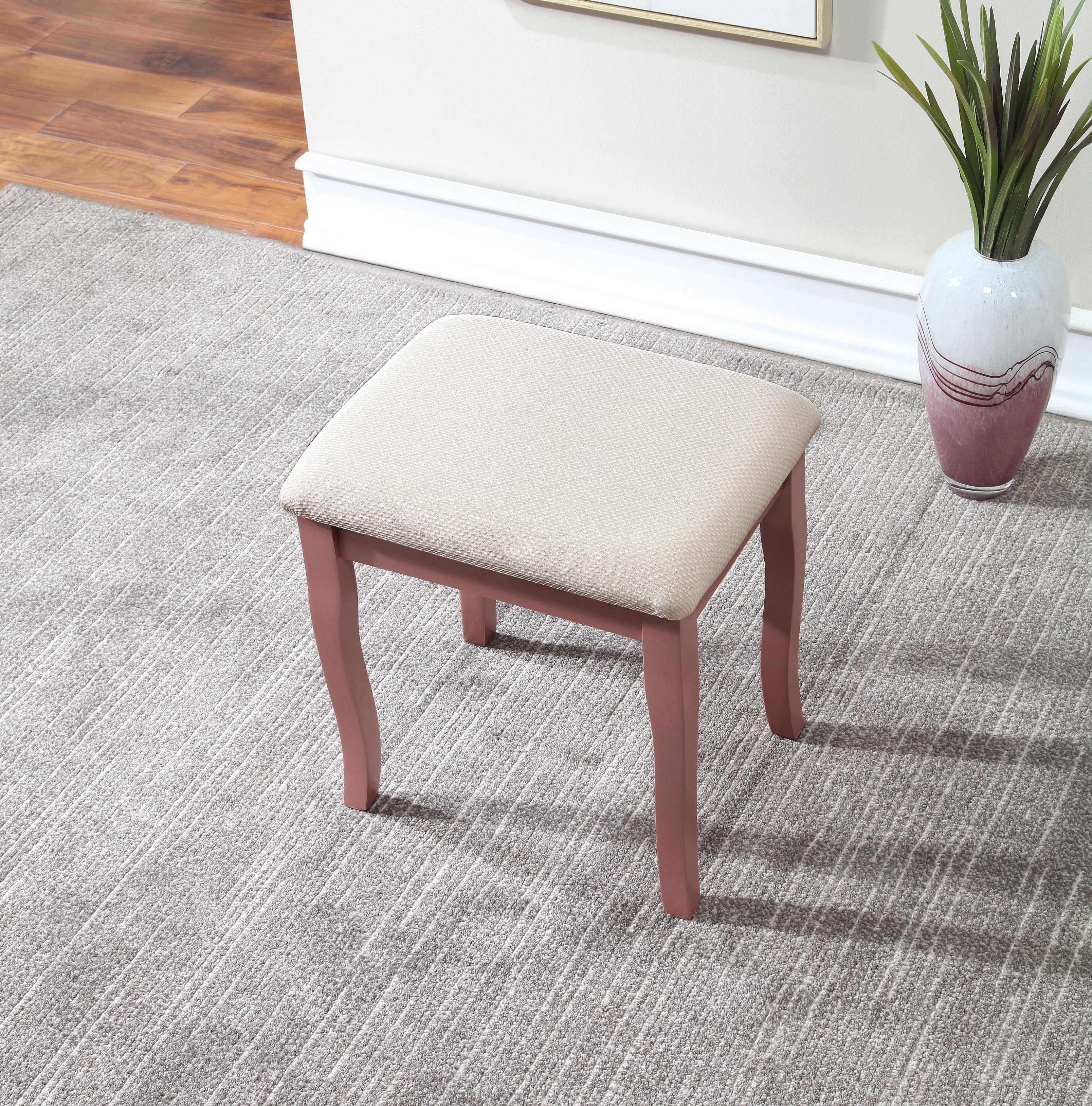 Sanlo Wooden Vanity Make Up Table and Stool Set, Rose GoldA simple design and handy storage features ake the Sanlo Wood Vanity Set perfect for any bedroom. It's gonna be an essential piece in your bedroom, as well as a perfect gift! With chair and mirror for galore and quality accents like French and English dovetail joinery make this piece an instant heirloom. The tri-fold mirror is moveable for a three-sided view that's perfect for makeup and hair. It also includes a matching wooden stool with padded upholstered seat.
