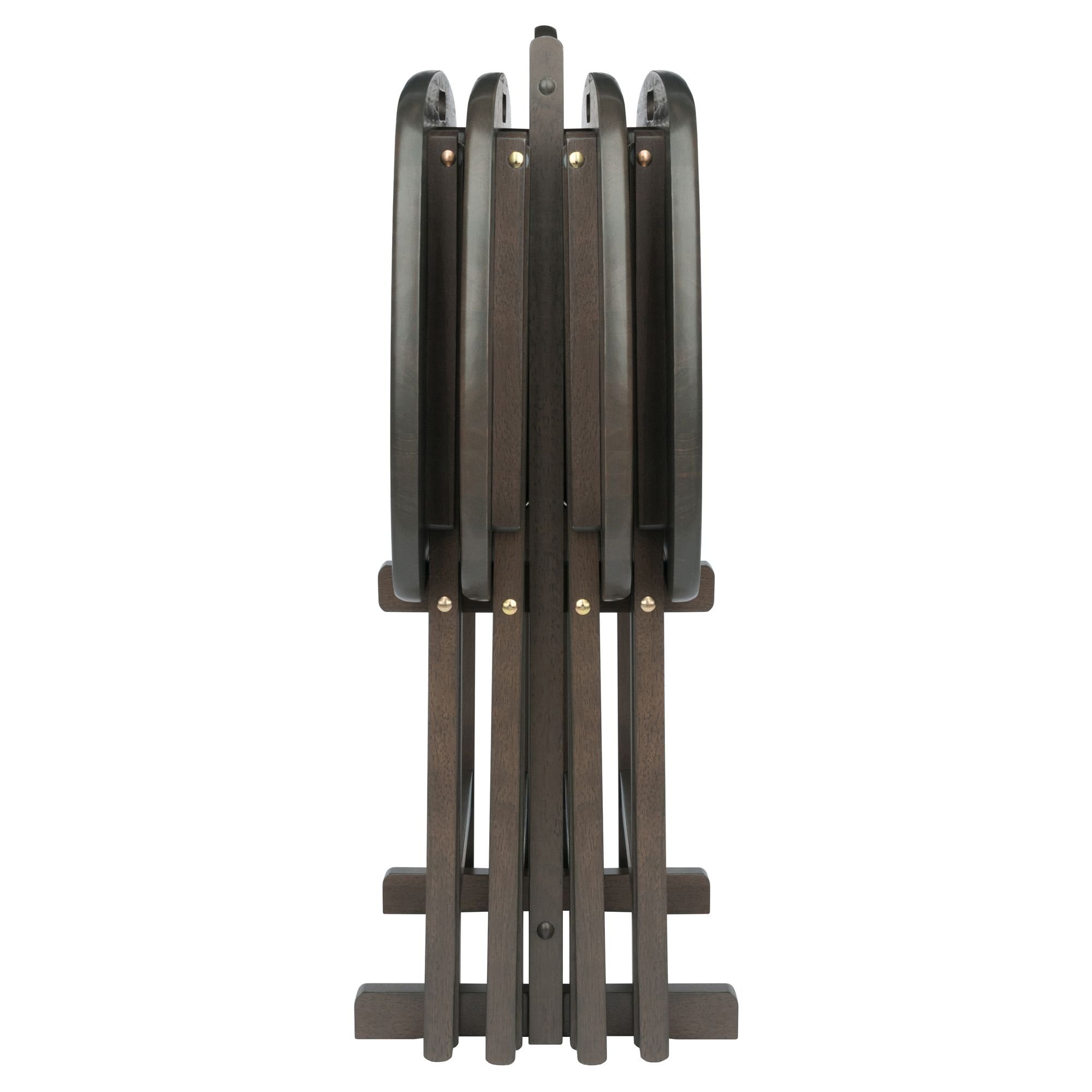 Make entertaining simple and easy with the Winsome Wood Lucca 5-Piece TV Table Set. A perfect companion piece for a casual meal in front of the TV or on the patio. Four folding snack tables great for daily use and compact enough to store in the closet. An upright stand is an innovative addition to this set as it serves as a rack to store the folded tables discretely when not in use. These beautifully finished trays are convenient and make meal serving simple when you need it. The wide 22.8' oblong portable folding TV table set provides users easy handling so they can lift the trays off the stand using the cutout handles in the table. You can move them closer to a sofa; chair or even into a different room. Winsome TV tables are ideal for small apartments; dorms and offices. They can also be used to prop up a laptop; play cards or other board games; apply nail polish or sort coupons. These light weight tables are portable and practical; fold up and place back on the stand for compact storage. Notches on the stand keep the folded tables securely in place. With its many uses and advantages; the Lucca 5-Piece TV Table Set is a piece of furniture you'll appreciate and be glad you own. Constructed of solid wood in a contemporary oyster gray finish. Conveniently packed and shipped in 1 box; that includes the hardware necessary for assembling the stand. Tables arrive ready to use and require no assembly. Replacement part request can be submitted directly to the manufacturer within 60 days from date of purchase.
