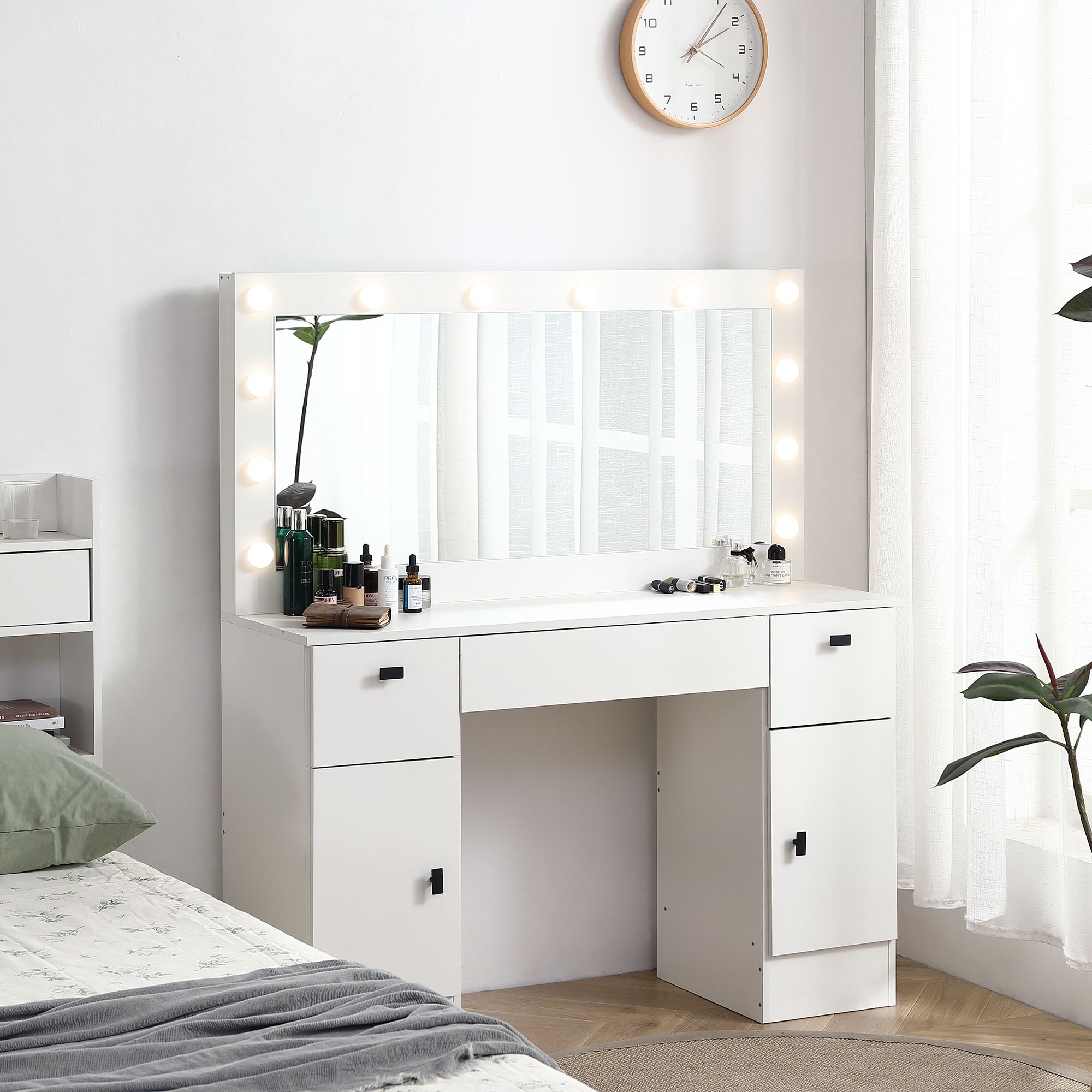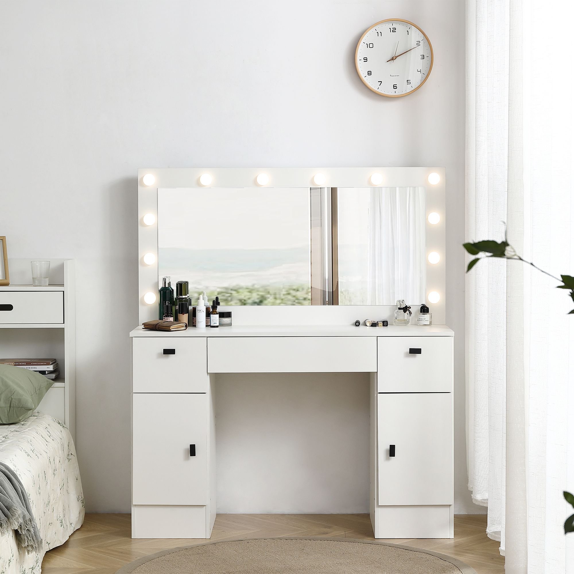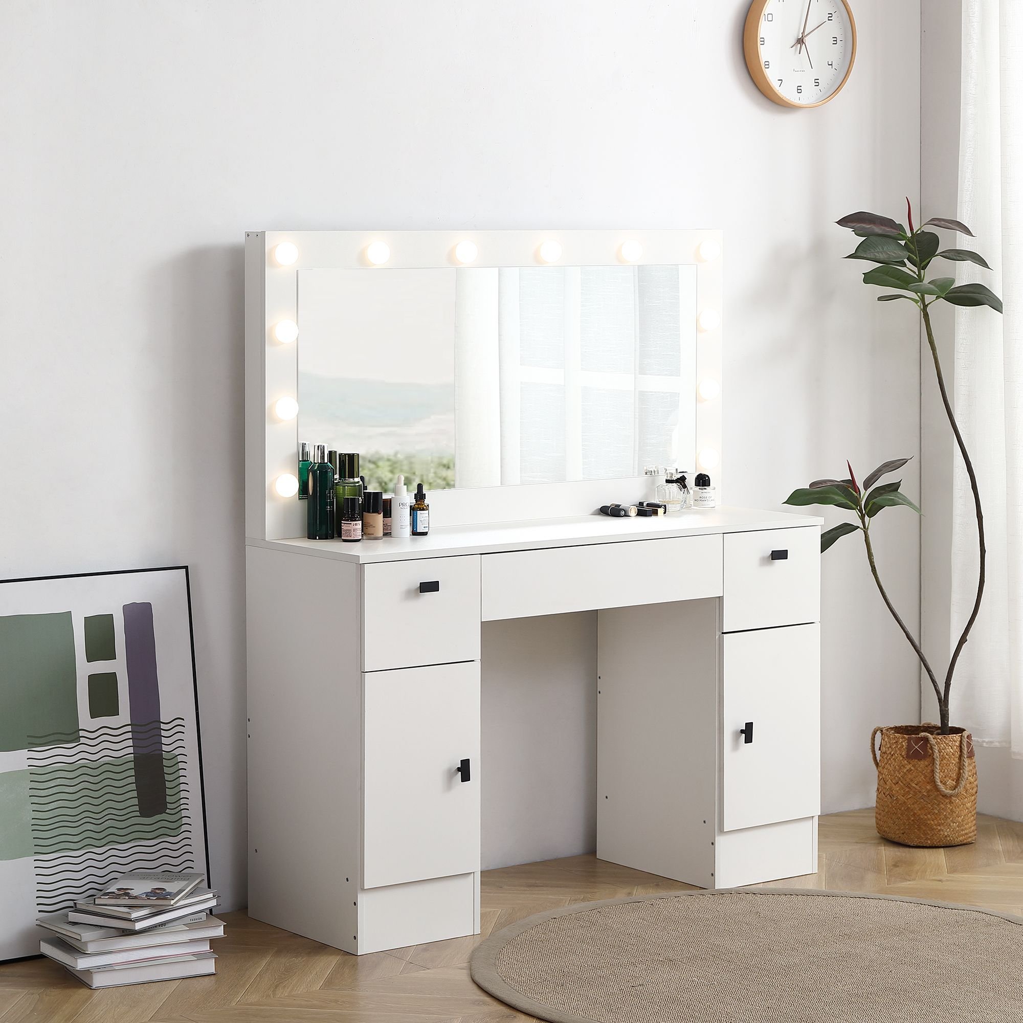 Stylish & Large Mirror Design: white vanity desk and stylish lighted mirror take your beauty needs into first account, what's benefit that the distance from drawer bottom to the floor is 29.9'', surely it meets your daily sitting height.